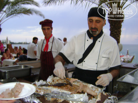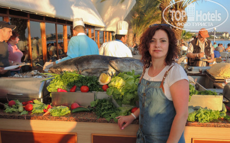 Работу его считаю нормальной , всегда находили, что можно поесть на наш вкус . Отдыхающих конечно много, отель заполнен на сто процентов, но мы ходили во второй половине, поэтому столик всегда находили на открытом воздухе. Огромный плюс отеля- обеденная терраса с видом на МОРЕ!!! Посетили ресторан «А ля карт», жаль что выбрать можно только один из двух, Турецкий или Рыбный. Вкусно, только не меню предложили для выбора, как это бывает, а просто подавали блюда, а они ооооочень большие, и не понятно , это все, или еще что то принесут, на десерт было мороженое и очень даже вкусное . Не хватило хоть немного, но живой музыки, это же ресторан….Кстати, а мороженое за 11 дней смогли попробовать только 1 раз, его подают в кафе на пляже, мы застали его в 14.30. Время мороженого не отмечено нигде, мы не увидели. Ладно мы, а у кого дети? Им, наверное, этого сиииильно хочется.